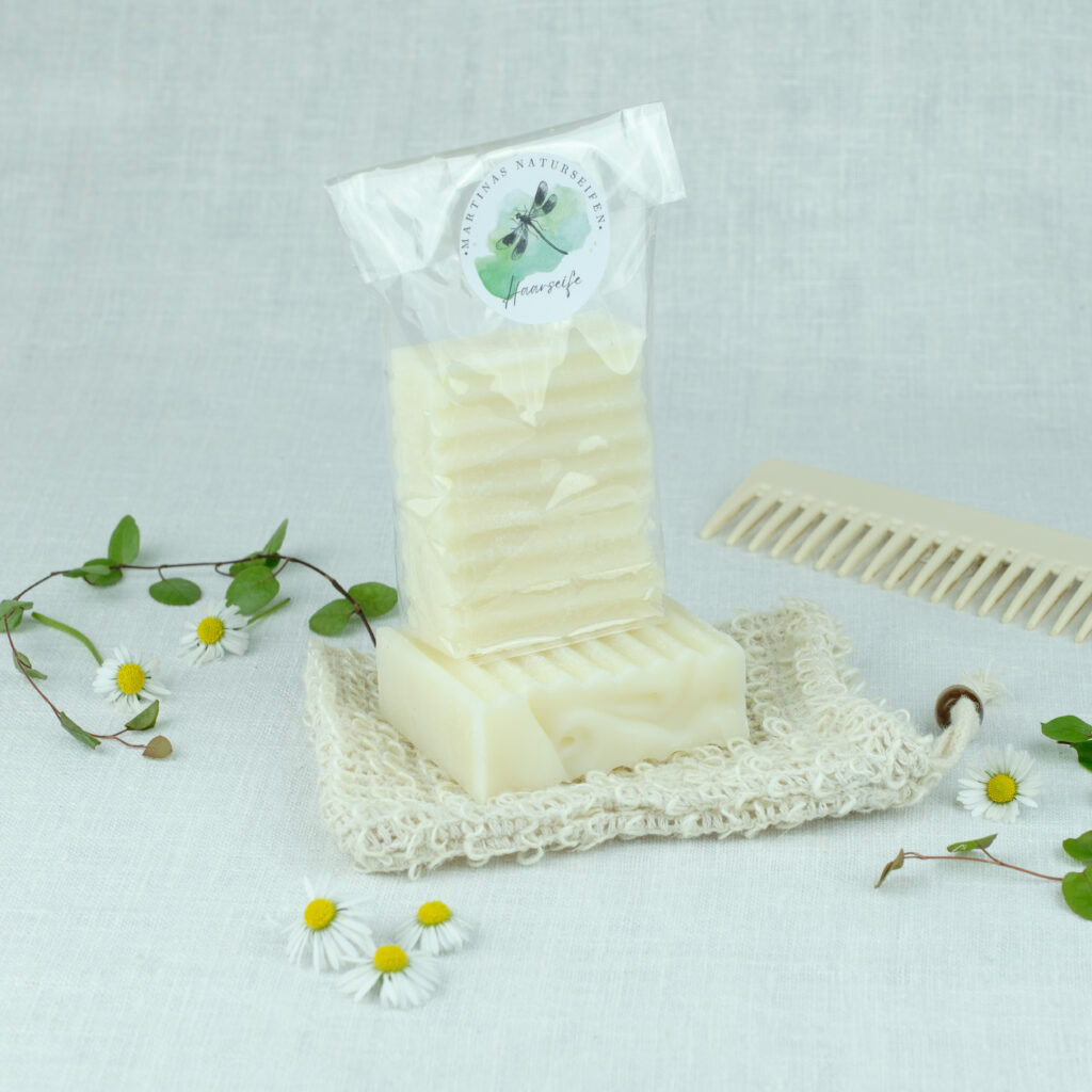 Haarseife – Sie ist nur mit 5% überfettet. Außerdem enthält sie Zitronensäure, die für den sauren pH-Wert der Haare zuständig ist. Einfach die Haare nass machen und die Seife einmassieren. Schäumt wunderbar. Rosmarin u. Lorbeeröl beruhigen zusätzlich die Kopfhaut.